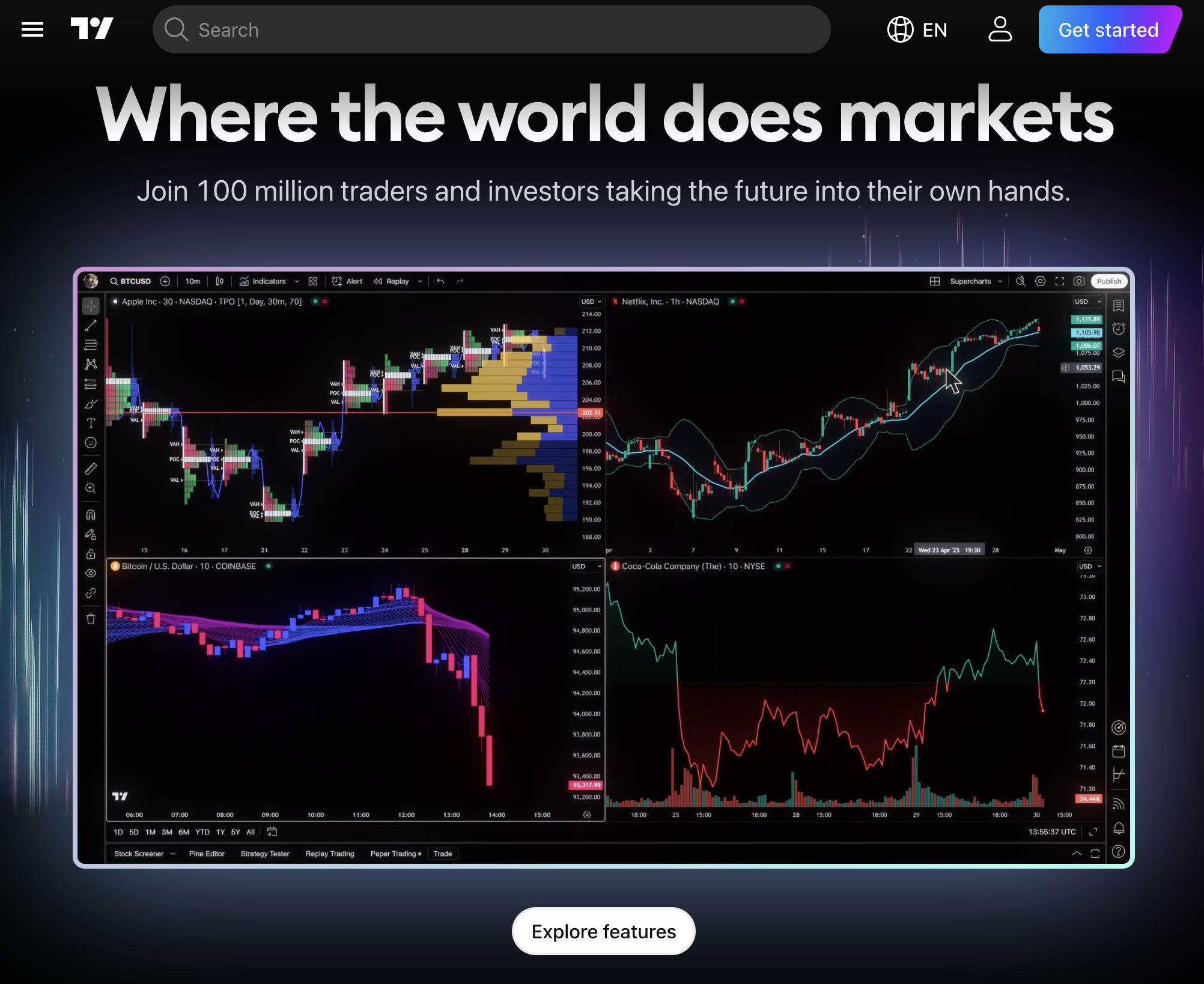 TradingView shines through its powerful backtesting, deep market screening capabilities, and ability to run sophisticated analysis across multiple assets. The extensive Pine Script library offers over 100,000 community-built indicators, making it ideal for experienced users seeking advanced technical analysis and automated strategies.